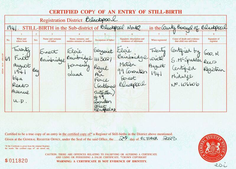 Sadly the couple had only been married just over 10 months when Elsie was widowed, she was pregnant at the time and sadly only nine days later she gave birth to a still born child, a boy, on 21/8/1941