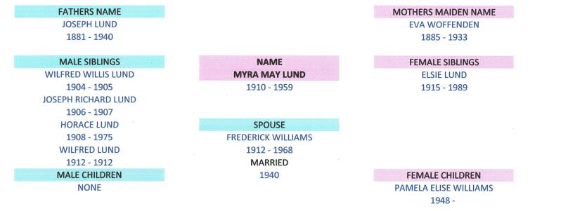 May was the fourth child born to the family, and already had 3 siblings; Wilfred Willis Lund (1904-1905) Joseph Richard Lund (1906-1907) and Horace Lund (1908-1975) preceding her. However tragedy had befallen the family previously with the passing of both Wilfred Willis aged 8 months and Joseph Richard aged 10 months. Horace however thrived and went on to survive his younger sister, eventually passing in 1975 having reached the age of 67 yrs. May would go on to have a sister, Elsie Lund (1915-1989) and another brother, Wilfred Lund (1912-1912) Sadly tragedy was to strike the family again when Wilfred passed at the age of just 6 months.