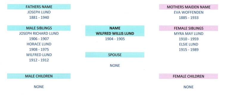 The family would go on to raise five other children in the future; Joseph Richard Lund 1904, Horace Lund 1908, Myra May Lund 1910 and Elsie Lund 1915. Sadly the family would suffer further loss with the passing of Joseph Richard Lund aged 10 months and Wilfred Lund aged just 6 months.