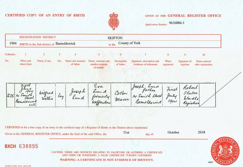 Wilfred Willis Lund was born on 5/6/1904 at 14 Smith Street, Barnoldswick in the West Riding of Yorkshire. He was the first born child of Joseph Lund, a Cotton Weaver (1881-1940) and Eva Lund nee Woffenden (1885-1933)